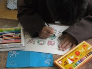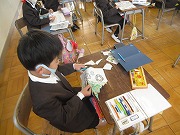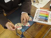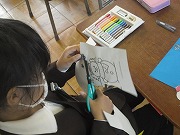 1年生が図工でクリスマスカードを作っていました。紺色のカードには白で雪の結晶の絵を描きました。そして、飾りにする絵に色を塗って切り抜き、貼りつけます。