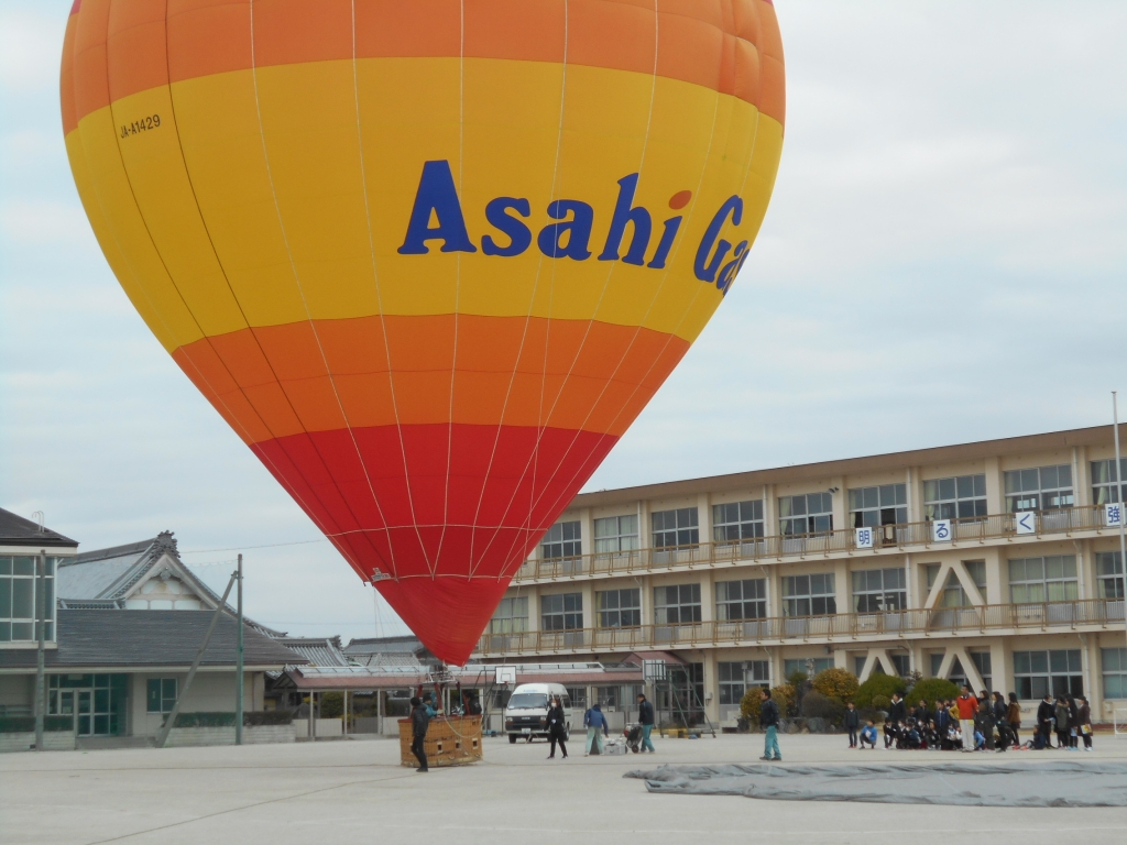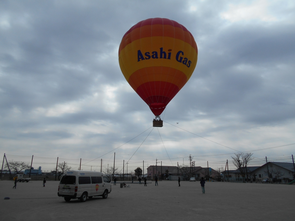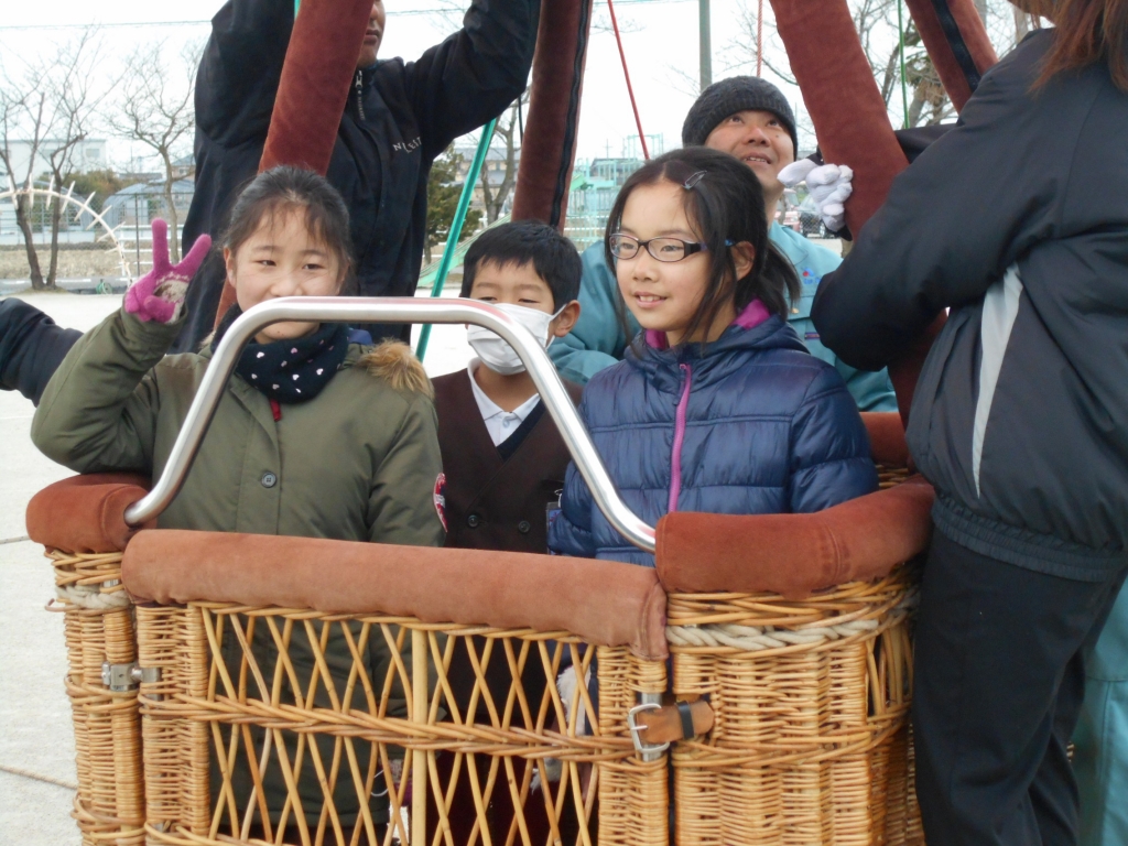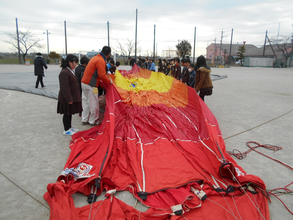 熱気球体験がありました。朝、8時半ごろは、風があり、気球に乗ることは無理かもしれないと危ぶまれましたが、4年生が全員体験することができました。
