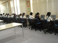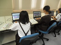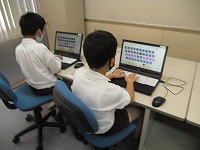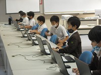 3年生が、ローマ字のタイピング練習をコンピューターのキーボードで行っていました。画面にキーボードの絵が出てきて、押すべき文字の色が変わります。その文字の色を押せば次の文字の色が変わります。場所を間違えるとミスと判定されて、最後に正しい文字数とミスした文字数が結果として表示されるので、子どもたちはゲーム感覚で楽しみながら取り組んでいました。