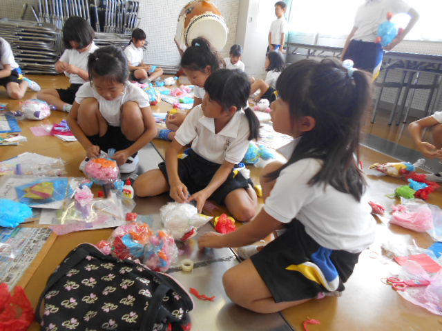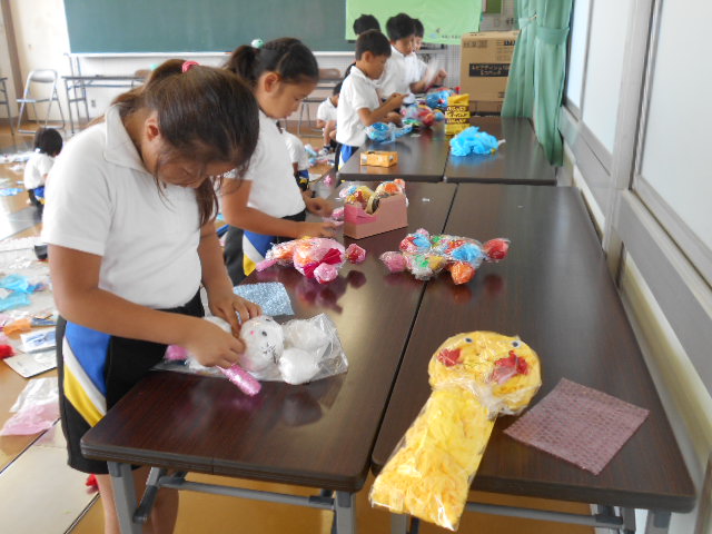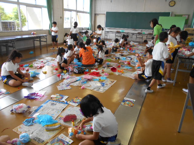 3年生は、図工の勉強で、「カラフルフレンド」を作りました。色とりどりでみんな楽しそうです。作品展のときの看板に飾る予定です。