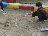 4年生が理科で噴水の実験をしていました。空気と水の性質を利用して、ボトルの中に入れた水を、空気を使って押し出すのです。