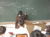 4年生が算数で小数倍について学習していました。100cmのテープに対して120cmのテープが何倍かなど、整数倍の考え方をもとに計算しました。