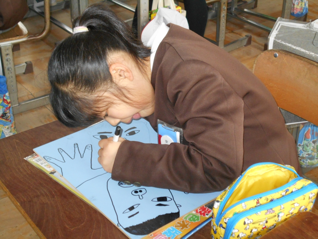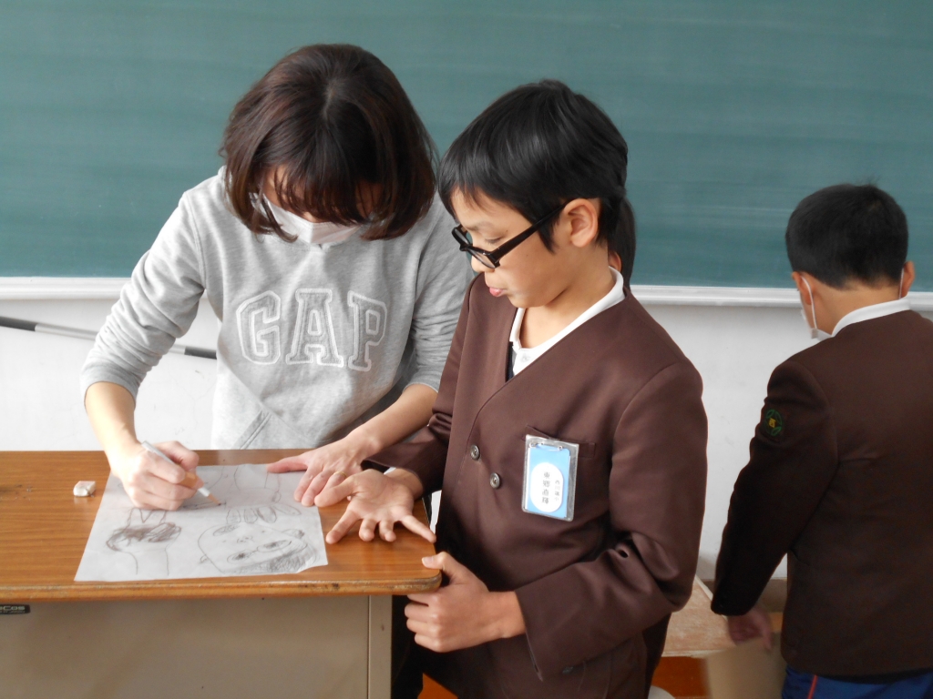 4年生は、版画の続きをしました。先生にアドバイスを受けながら、板に絵を描いていきます。