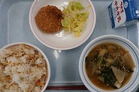 「人参(にんじん)」を使った「人参とツナの混ぜご飯」。「蓮根(れんこん)」を使った「蓮根コロッケ」、「キャベツ」を使った「キャベツの沢庵(たくあん)和え」、そして「白菜・大根・なす、越津ねぎ」を使った「愛西野菜の味噌汁」です。