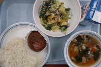 卓袱(しっぽく)うどん(白玉うどん) 牛乳 海藻サラダ 米粉いちごマフィン