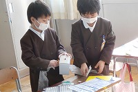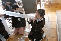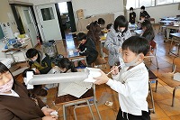 1年生が図工で、細長いビニール袋に空気を吹き込んだ時の様子を利用した工作に取り組んでいました。びっくり箱のようにするのか、何かの動物や昆虫の形や動きを表すのか、面白い動きを取り入れます。