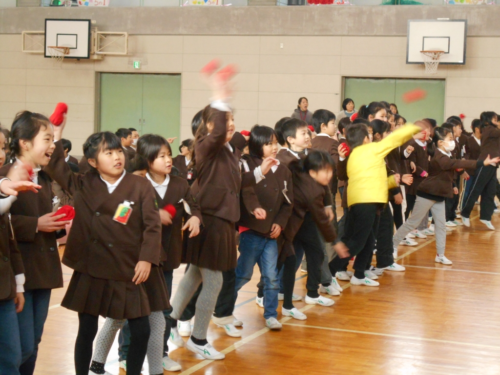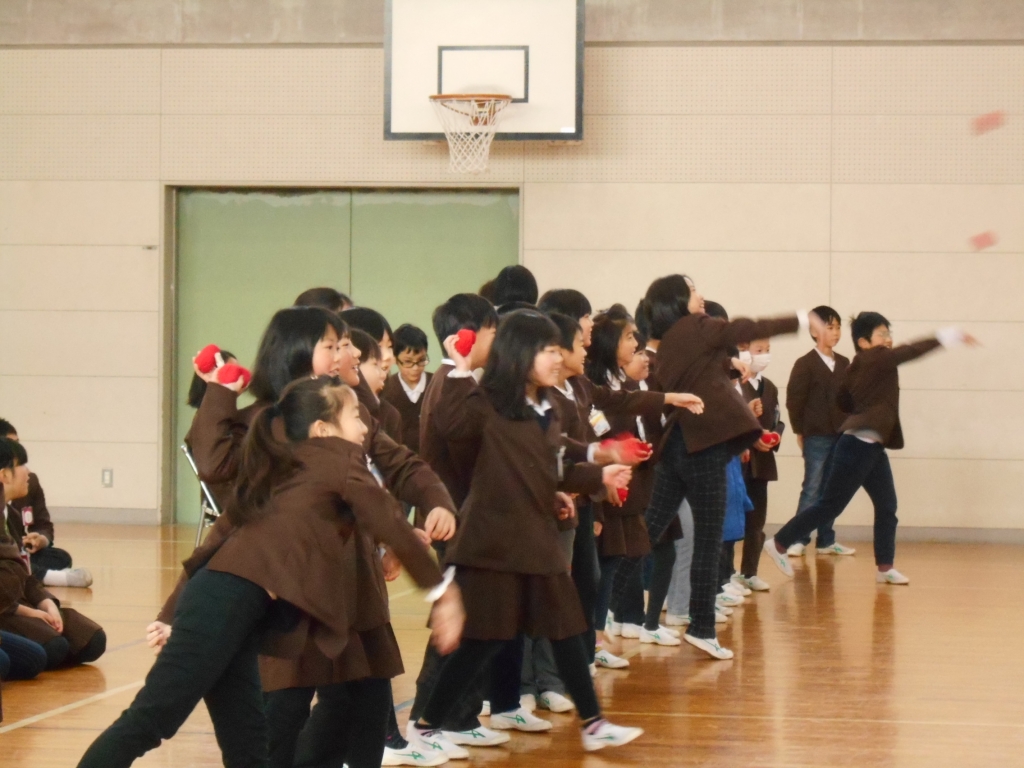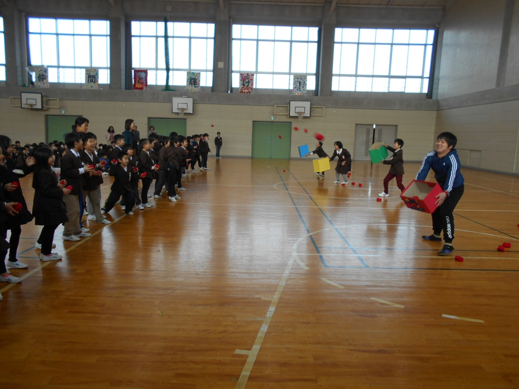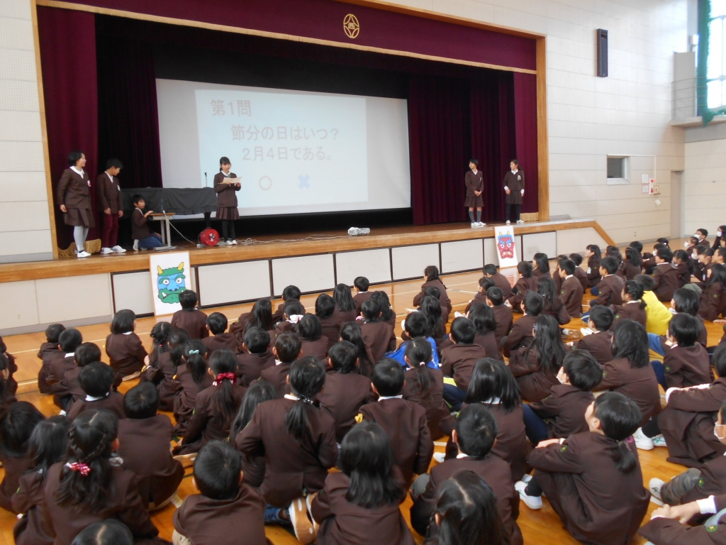 児童会役員主催の2月5日に実施予定だった鬼退治集会。インフルエンザ流行のため、延期され、本日行われました。まず、鬼退治ゲームでは、「鬼は外、福は内」と言いながら、箱に玉を入れます。学年で競ったら、2年生が一位でした。次に、節分にちなんだクイズをしました。正解すると低学年は大喜びをしていました。