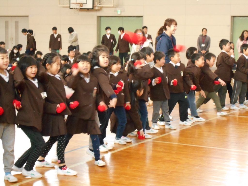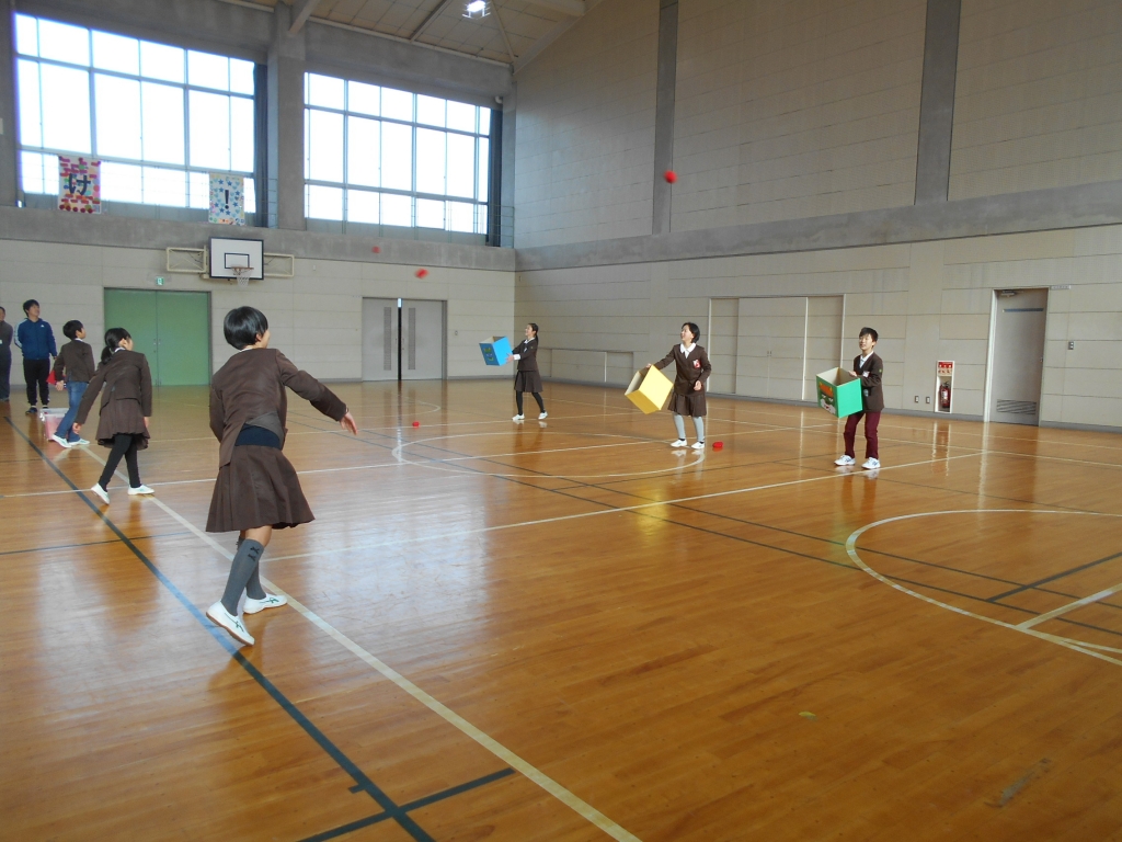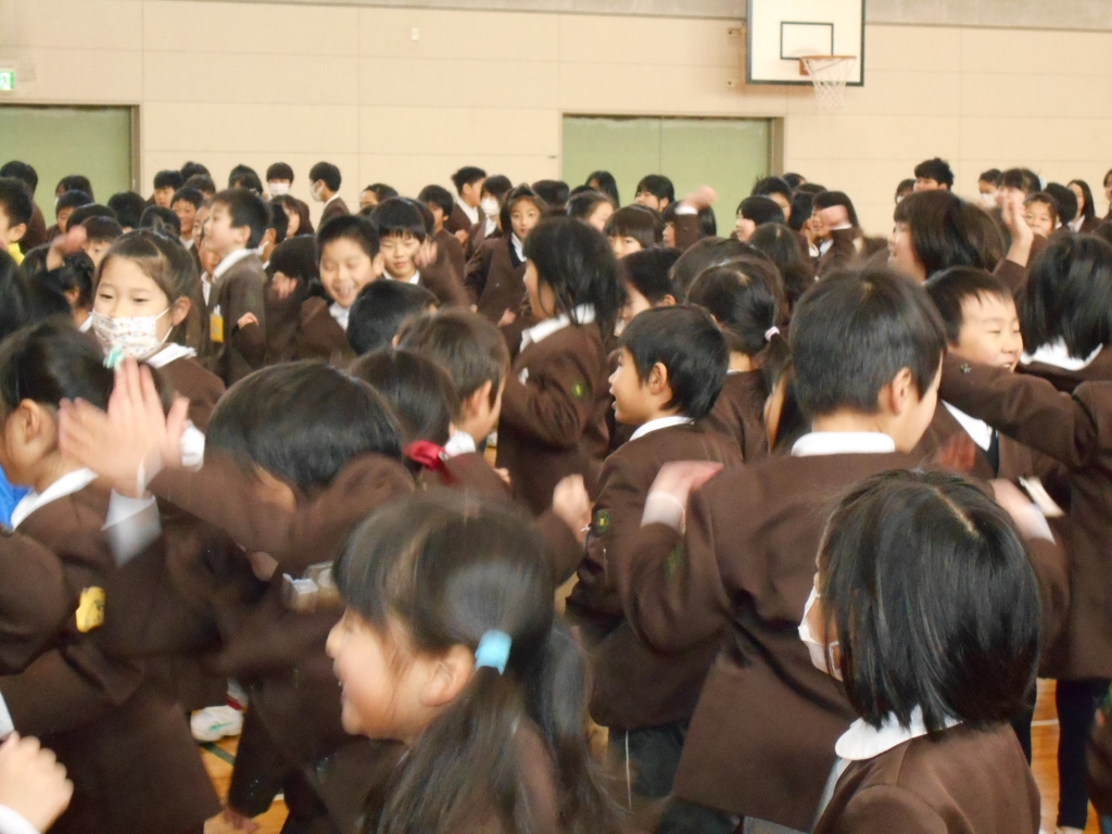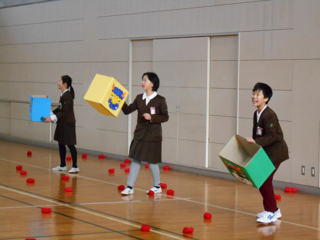 児童会役員主催の2月5日に実施予定だった鬼退治集会。インフルエンザ流行のため、延期され、本日行われました。まず、鬼退治ゲームでは、「鬼は外、福は内」と言いながら、箱に玉を入れます。学年で競ったら、2年生が一位でした。次に、節分にちなんだクイズをしました。正解すると低学年は大喜びをしていました。
