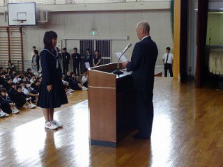 土曜日に行われた海部地区陸上大会の女子200mで1位を収めたものとバスケ女子のシンデレラカップで優秀選手に選ばれたものの表彰伝達が行われました。
