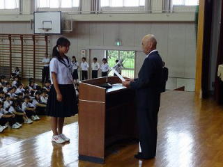 今日は、朝礼がありました。まずは西尾張陸上大会の表彰伝達が行われました。校長先生のお話のあと、生活委員長から今週の週目標が発表されました。今週の週目標は「整理・整頓をしっかりしよう」です。