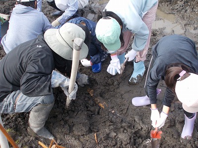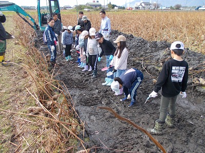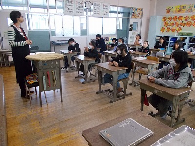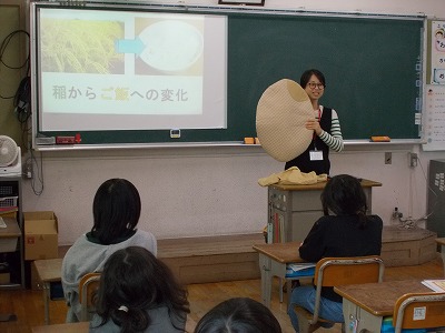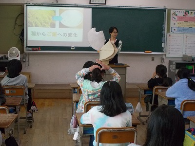 子どもたちは、栄養教諭の先生が持ってきた布製の「お米」が、籾がついた状態から、玄米、胚芽米、白米へと変身していく様にとても興味をもったようです。