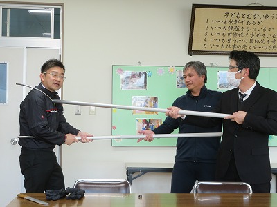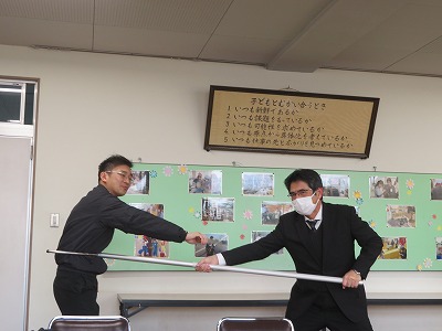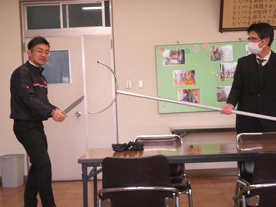 、授業後に津島警察生活安全課の方を講師兼不審者役として訓練を行いました。校内に侵入した不審者に教職員が対応しつつ、さすまたを使って不審者の侵入を防ぐなど、実際を想定した訓練となりました。