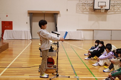 なわとび集会では、低学年の課題種目は前とびで、自由課題は後ろとび、かけ足とび、あやとびのいずれか一つです。どちらも1分間に何回とぶことができたかを記録します。