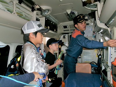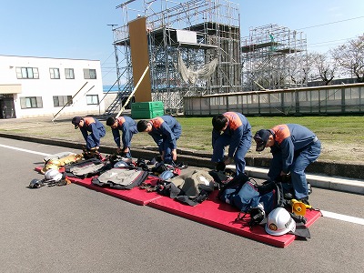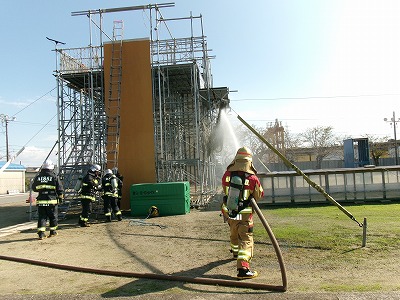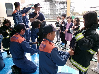最後に普段の消防訓練の様子を見せていただきました。機敏に動かれる姿を見て、子どもたちは、「すごーい!」と感嘆の声をあげていました。
