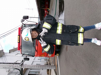 まずは、放水体験です。消防服を着て、一人ずつ、放水体験をしました。重い消防服を着るのを消防署の方々が手伝ってくださいました。火をめがけて放水するのですが、なかなかうまく当たりません。苦労している子もいました。