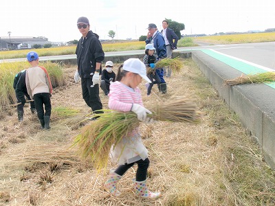 次は、3年生、4年生です。それぞれが稲を6株刈って、縛って運ぶまで行いました。最後に2年生と5年生です。2年生と5年生がペアで行います。2年生も初めて鎌を持って稲刈りをしました。