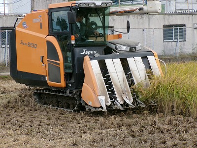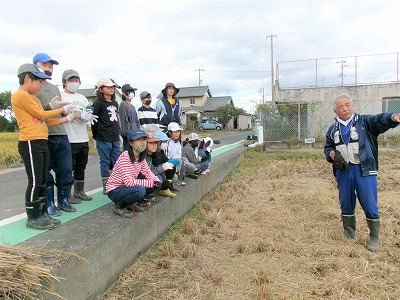 5年生は、杉村さんにいろいろ質問をしながら、お米づくりについて学びました。最後は、コンバインで残りの稲を刈ってもらいました。