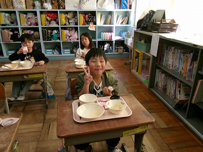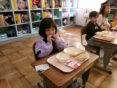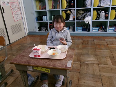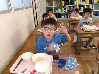 立南小の児童は、給食後におはぎをいただきました。1年生は、初めて学校で食べるおはぎです。おいしそうに食べていました。