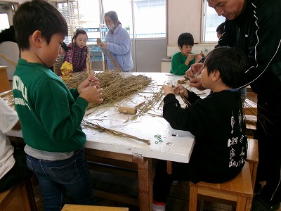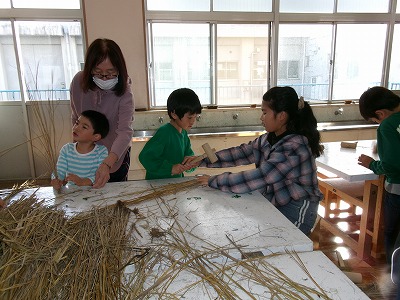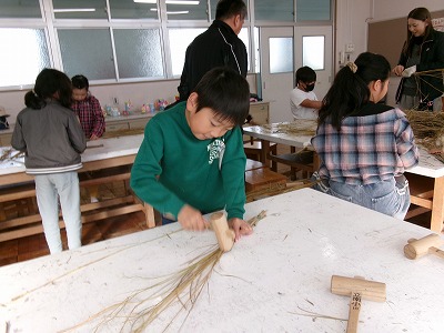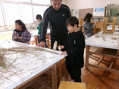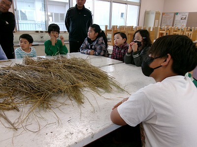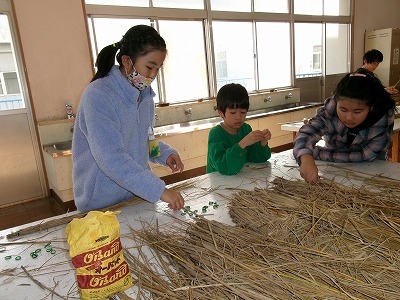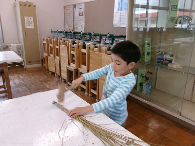 12月には、地域の方に来ていただき、縄ないを教えていただく予定です。これを使って、お正月用のしめ飾りを作ります。