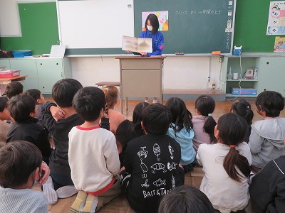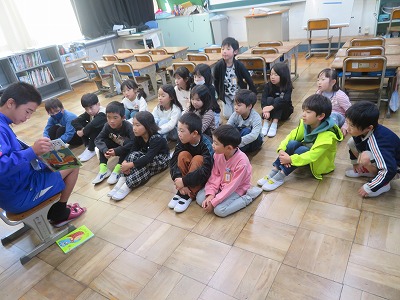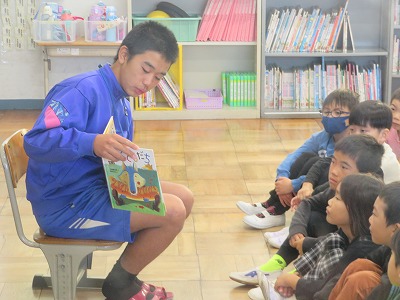 立南タイムでは、1・2年生の教室でそれぞれ読み聞かせをしてくれました。子どもたちのために絵本を選んで、練習してきてくれました。子どもたちは、中学生の読み聞かせを食い入るように聞いていました。