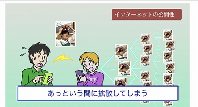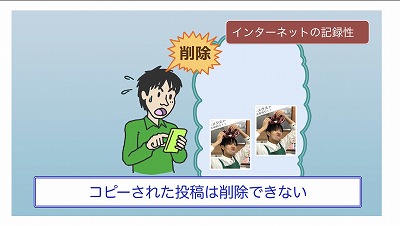 インターネットには、「拡散」といって、よいことも悪いことも簡単に広まってしまう危険があります。軽い気持ちであげた写真は、他の人もコピーできてしまうので、完全に削除できません。