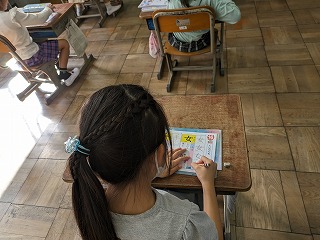 1年松組の国語の時間の様子です。漢字の学習が始まっていました。先生から、一画一画、丁寧に書くようにお話がありました。とめ、はね、出るところなどにも注意しながら、練習しています。