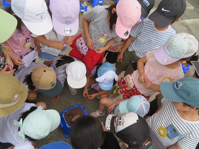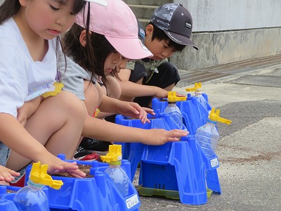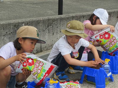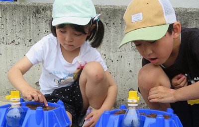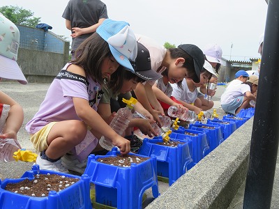 1年生の生活科は、アサガオの種まきです。一人一人に配られた土を植木鉢に入れてならします。先生の見本をよく見て、土に穴をあけて種をまきます。次に配られた肥料を見て「これもたね?」「石?」と不思議そうな子どもたちに、先生から「肥料はみんなにとっての『給食』のような元気のもとです!」と説明をうけると、「ごはんだよ~」とささやきながら土にまんべんなく肥料をまきました。最後にたっぷりの水をやって、種まき完了!明日の朝から、毎日忘れずお水をやって、大切に育てていきましょう!