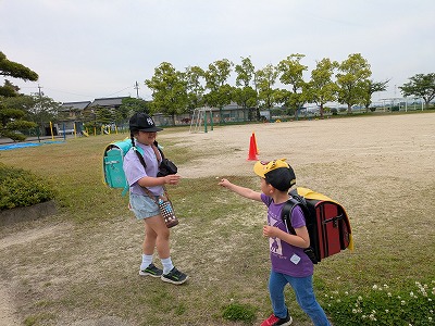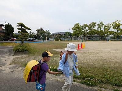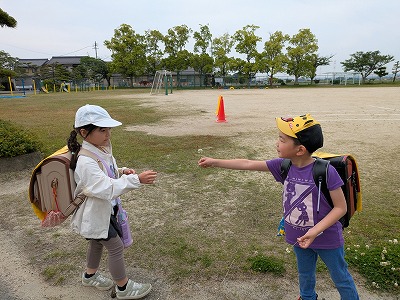 朝のあいさつ運動を手伝ってくれる1年生の子がいます。