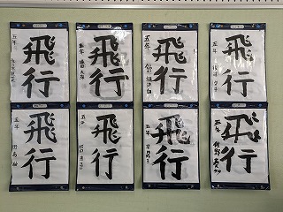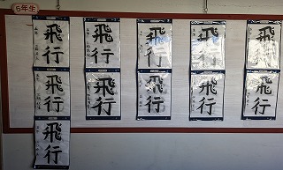5年生の掲示板です。今は、習字作品「飛行」が掲示されています。