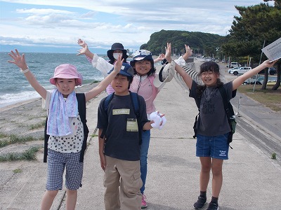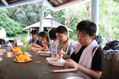 1日目は、野外炊飯でみんなで協力してカレーライスを作り、その後はウォークラリーに出かけました。海や山に囲まれた自然豊かな知多をグループごとに回りました。途中では、先生やキャンプカウンセラーさんのポイントがあり、協力してお題をクリアしていきました。