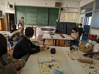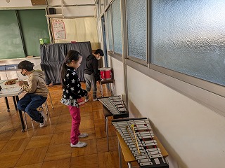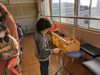 3年松組の音楽の授業の様子です。「おかしのすきな まほうつかい」という曲の中で、魔女が魔法をかけるシーンが出てきます。魔法をかけるシーンに合う音楽を考えました。いろいろな楽器を鳴らして、「まほ