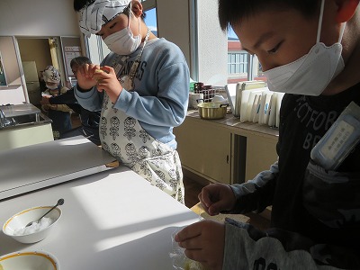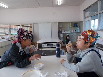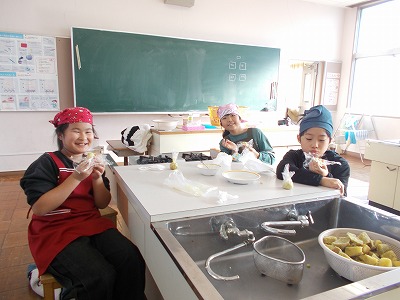 完成!!一人2個ずつ作りました。6年生は、1個余分に作りました。あっという間です。最後に試食、片づけです。自分で作った「いもきんとん」を試食しました。「おいしいねから」「砂糖を入れすぎた!」「砂糖がよく混ざっていなかった。ここ、見て砂糖のかたまりが…」みんな、協力して後片付けをすることができました。