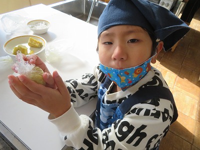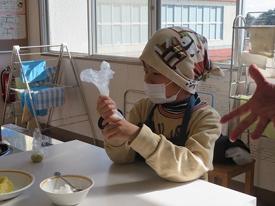 スプーンに1杯の砂糖をビニル袋に入れて、砂糖をまんべんなく混ざるように、手でおいもをつぶします。あまり、力を入れずぎると、ビニル袋がやぶれてしまうので、袋が破れない程度に…との先生からの注意がありました。ある程度、なめらかになったところで、四角に切ったラップの上に、さきほどのおいもを袋からあけます。そして、ラップの4つの端をつまんで、クリクリ。茶巾しぼりです。