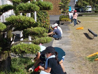 朝方の雨がうそのように晴れ渡った5時間目に、全校で除草活動を行いました。学校支援ボランティアの方も5名参加していただきました。