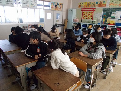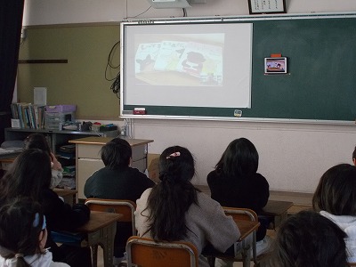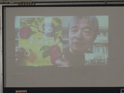 今日のゲストは、絵本作家のたかだしんいちさんで、東京都東村山市からのオンラインでした。たかださんは、ご自身の「てぶくろう」という絵本を例にアイデアを思いついてから絵本なるまでの過程について話していただきました。ストーリーを考え、調べたり取材をしたりしてから、文と絵をかき、原稿を印刷したものを何回もチェックして、ようやく完成し、その間5年という歳月がかかったそうです。読み聞かせなどでよく目にしている絵本ですが、作家さんから実際に「絵本ができるまで」を語っていただき、児童は、興味津々な様子で聞き入っていました。