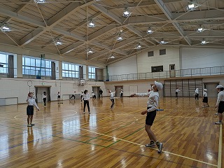 5年松組では、体育の時間にバドミントンを行っています。体育館全面を使って、高跳びの支柱や玉入れなどを利用してロープを張り、ネットとして代用し、全員がプレーできるようにしています。長く落とさずにラリーが続くよう練習しています。