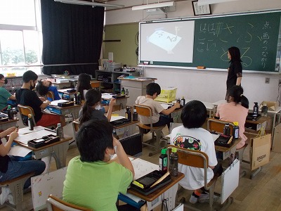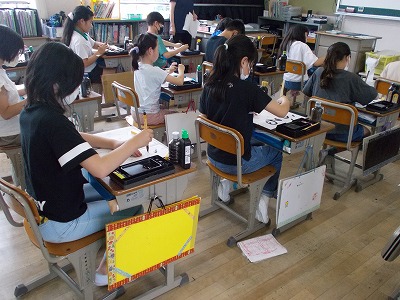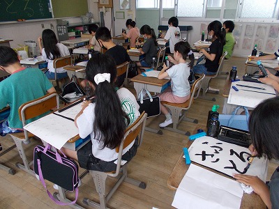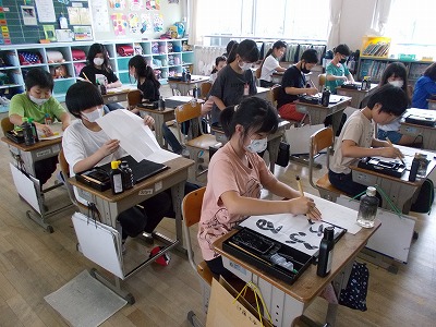 5年生の書写は、毛筆で「ふるさと」の文字を書きました。「ふ」「さ」「と」の3文字について、点・画が次に書く点・画につながるように筆を動かして、なめらかに書く練習に取り組みました。毛筆は、漢字よりもひらがなの方が、上手に書くことが難しいかもしれませんね。