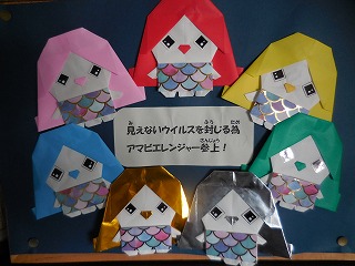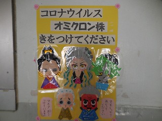 立田南部小学校では、いたるところに感染症予防を呼びかける手作りの掲示物があります。用務員さんの折り紙で作成された掲示物は、子どもたちの大好きなキャラクターでもあり、子どもたちがいつも立ち止まって見ています。