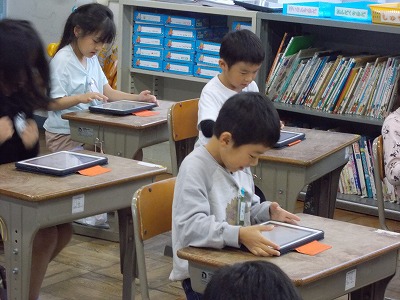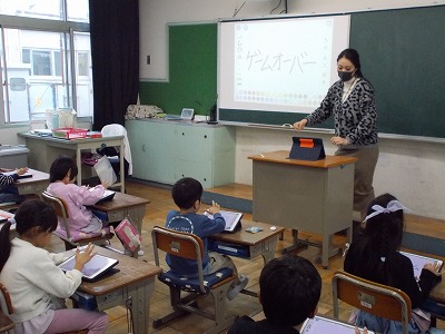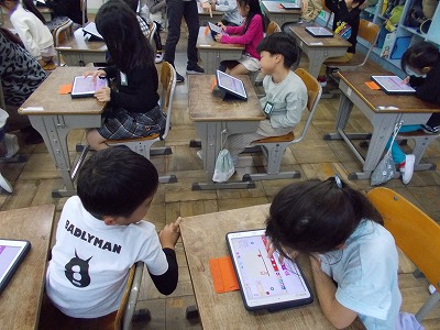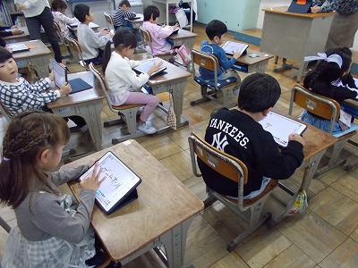 1年生が、「ジャンプゲーム」というゲームのプログラミングにチャレンジしました。ネコのキャラクターがジャンプしながら、ヘビとリンゴの2つの障害物に触らないように進んでいくというゲームです。シンプルですが、自分たちで動きなどのプログラムを組んでいくのは、1年生にとってはやや手強い課題だったようです。それでも、できたゲームに目を輝かせて取り組んでいました。中には、障害物の間隔や大きさを微調整しながら、ゲームを改良していく子もいました。1年生といえども、なかなかやるものだなと感心しました。