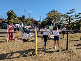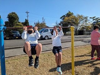 ちょうど、鉄棒をやっていました。逆上がりや懸垂など、それぞれの技の練習をしています。できたら、先生に見ていただいて、あとから「〇〇認定証」がいただけるというしくみです。子どもたちは、競って技の練習に励みます。「先生、見て!できたよ!」と、連続逆上がりをやって見せてくれる子も…。
