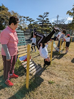 風が強い日でしたが、一生懸命、鉄棒の技に取り組む子どもたちの姿にたくましさを感じました。みんな、頑張れ!!