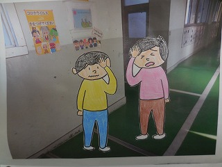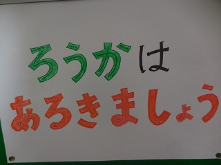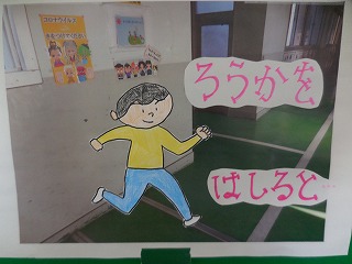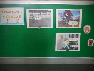 手袋をしたまま遊具で遊ぶと…つるっと滑って危険だよというメッセージや廊下歩行、ポケットに手を入れたままの歩行など、毎日の様子からけがにつながる行動に対しての注意喚起を子どもたちの中から発信できるのってすてきですね。