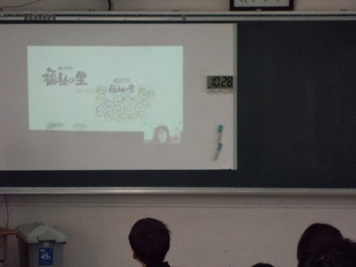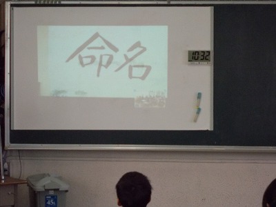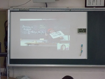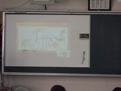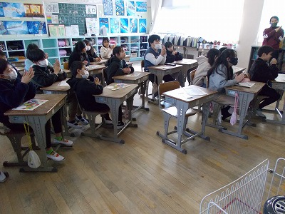 今回のゲストは「あきたまさん」で、「文字を書くこと」を20年にわたって仕事にしている方でした。いろいろなところに文字を書いてきた中で、特に、人の名前に詩を添えたものを色紙に書くという作品を今までに3万6000枚も書いてきたそうです。そして、その作品に書かれた自分の名前を見た人から「私の名前はいい名前だ」と喜んでくれた人をたくさん見てきたそうです。「『名前はその人についている』すなわち『その人の命についている』と感じました。なぜなら、人は生まれたときに『命名』され、その名前といっしょに生きてきたからです。命は大事なもので、その命についている名前も大事にしてほしい。」というあきたまさんのお話に、5年生の児童はじっと聞き入っていました。