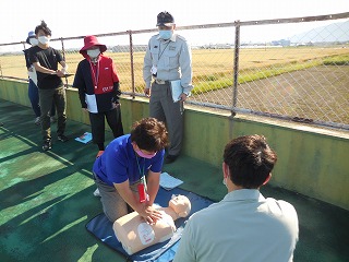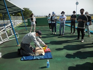 最初にAEDの使い方や心肺蘇生法の実習を行いました。強く、速く、絶え間なく胸骨圧迫を行うことは、何度行っても難しく、毎年「救命のリレー」の大切さを痛感します。