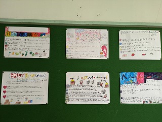 3年松組教室の背面掲示です。社会科で学習した「店ではたらく人々」という単元でスーパーマーケットに見学に行きました。その見学をして調べたことや考えたことをまとめました。スーパーのキャッチコピーを入れている作品もあります。それぞれが作成した作品が掲示してあります。