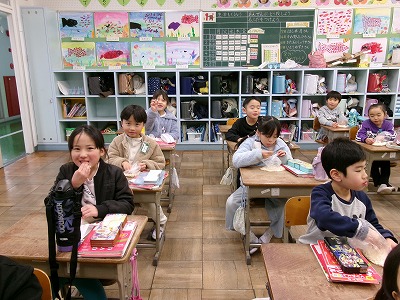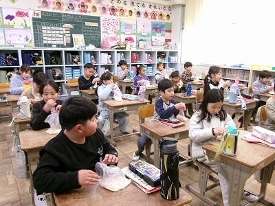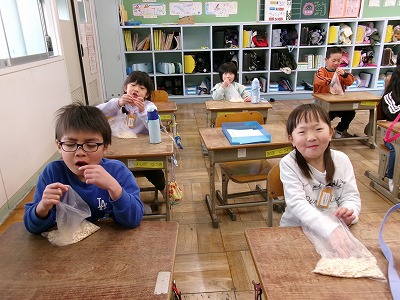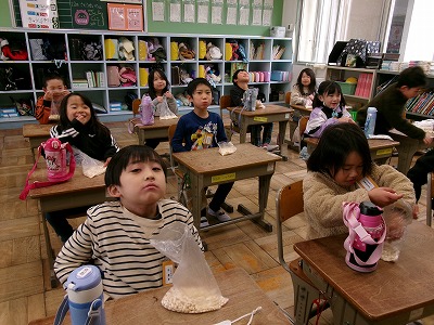 作っていただいたポン菓子は、一人ずつ袋に分けられ教室で担任の先生から配ってもらいました。5時間目においしくいただきました。ありがとうございました!