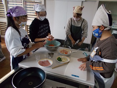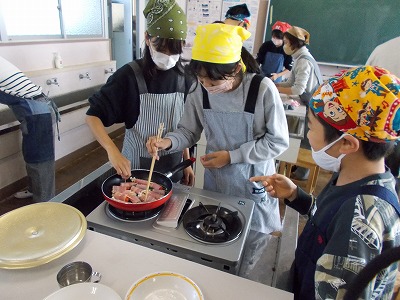 野菜を切る、ゆでる、ベーコンに巻く、焼くという手順で調理をしました。同時進行で使い終わった調理器具の片付けもし、各自の役割分担にそって順調に調理を進めていました。4名の学校ボランティアの方の適切な支援もあり、どの班も上手に仕上げていました。