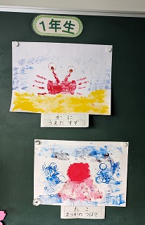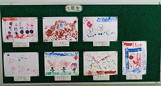 今は図画工作の「ぺったんコロコロ」という作品が掲示してあります。身の回りあるものやローラーに絵の具をつけて形を写しました。写した形がに何に見えるか、形や色を工夫してどんどん写しました。