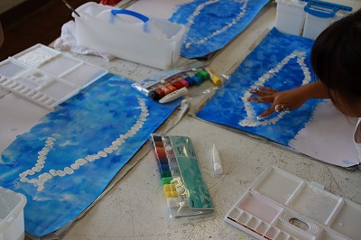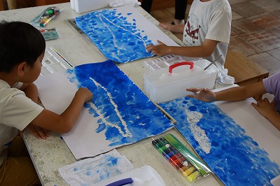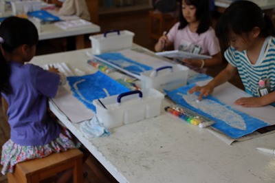 1年生の教室では、画用紙に描かれた大きな青空に、真っ白な絵の具でお団子のようなものを