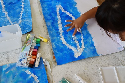 描いています。しかも、絵筆ではなく、指を使ってなんとも楽しそうです。よく見ていると、なんと、青空にくっきりと真っ白なくじらぐもが浮かび上がってきました!